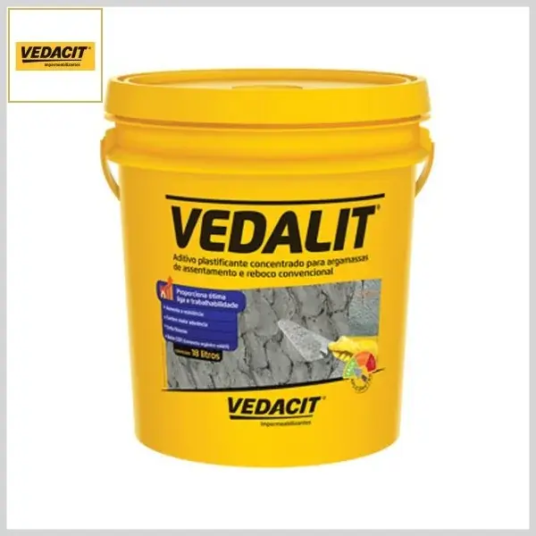 VEDALIT é um aditivo concentrado que proporciona ótima trabalhabilidade a argamassas e rebocos. Por ser líquido, facilita o trabalho, proporcionando economia de material e excelente acabamento. Agrega uma série de vantagens às argamassas: maior aderência, coesão, ausência de fissuras e menor exsudação. Argamassas preparadas com Vedalit não precisam ser curtidas.