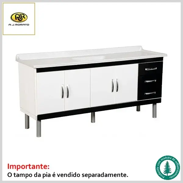 Gabinete de Cozinha Beijing 174.2cm Mdf 5805 4Portas+3Gavetas s/Tampo - Branco e Preto - AJ Rorato - Ref:12700